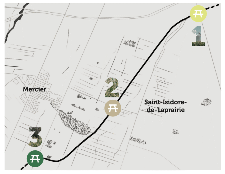 Dans le cadre de l’aménagement de circuits culturels et récréotouristiques dans la MRC de Roussillon, l’Usine à histoire(s) a été mandatée par la firme de design Merlicht pour participer aux étapes du concept et du scénario de trois haltes cyclistes. L’équipe a d’abord documenté puis élaboré les contenus pour chacun des modules d’interprétation. Inspiré par la dualité campagne/ville qui caractérise ce territoire, le concept met de l’avant les spécificités des paysages et de l’agriculture dans la MRC de Roussillon. Le contenu des haltes accorde une attention particulière aux initiatives agroenvironnementales qui sont en place dans la région.